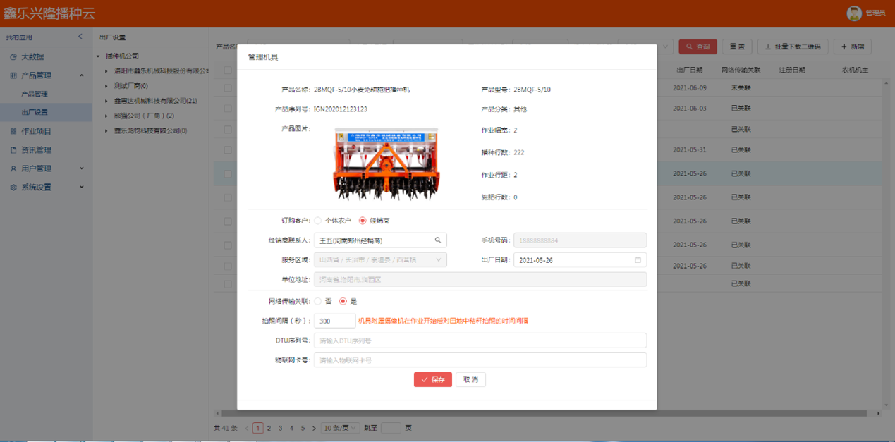 - 作業(yè)項目:為播種機(農(nóng)機)生產(chǎn)廠家和播種機(農(nóng)機)經(jīng)銷商提供作業(yè)項目跟蹤服務的功能。