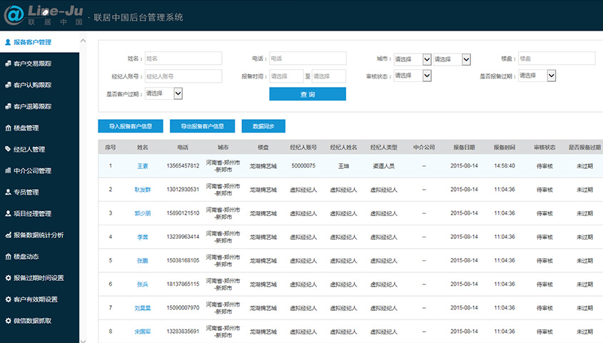 - 分角色功能: 系統(tǒng)劃分為不同的角色,根據(jù)角色不同,登錄系統(tǒng)使用的額功能不同。經(jīng)濟(jì)人主要用來報(bào)備客戶信息;專員用來判定客戶的有效性;項(xiàng)目經(jīng)理查看客戶的統(tǒng)計(jì)信息;中介公司也用來推薦客戶信息